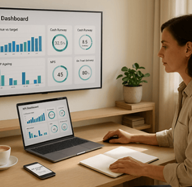 Role‑based views: Build tailored pages for CEO (growth, cash, margin), Operations (WIP, throughput, defects), Finance (AR/AP ageing, runway, variance).